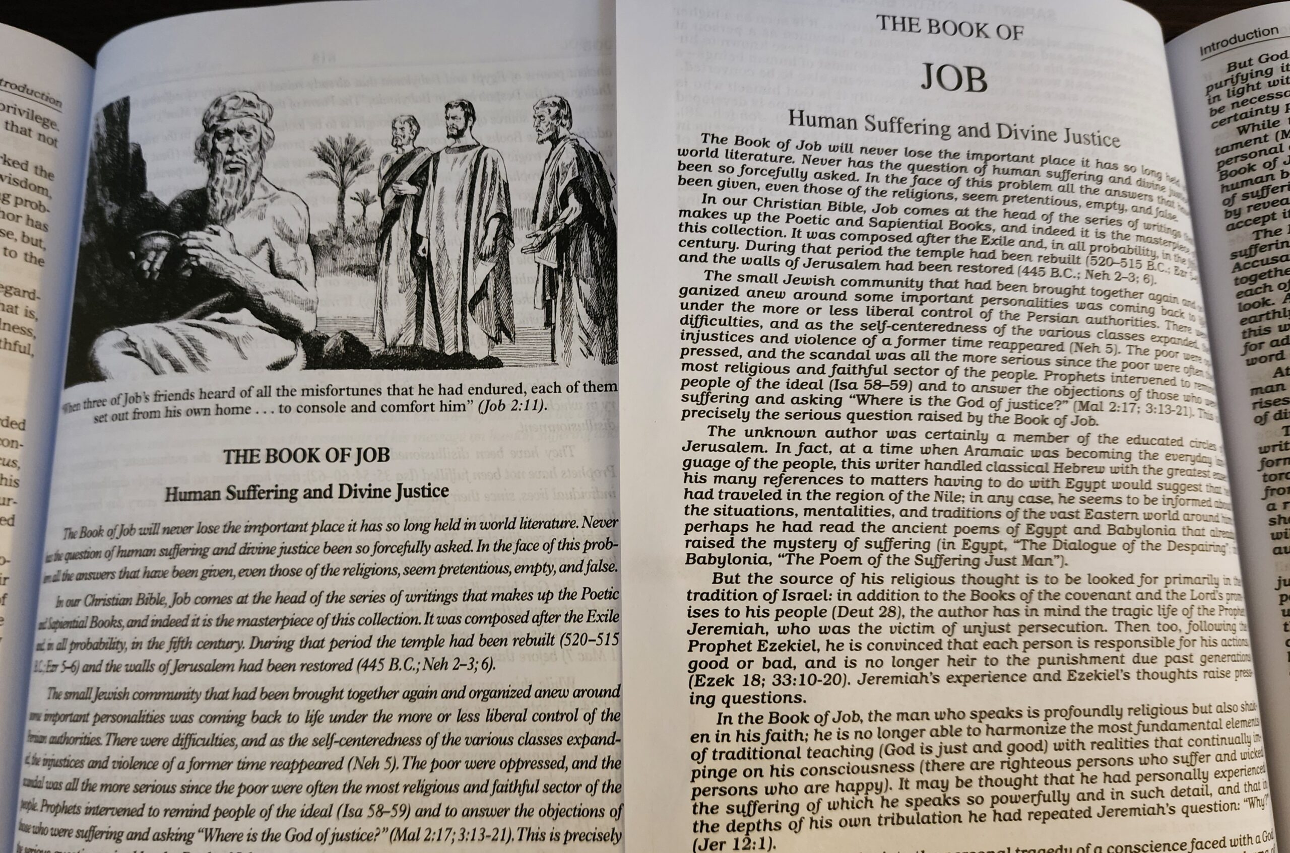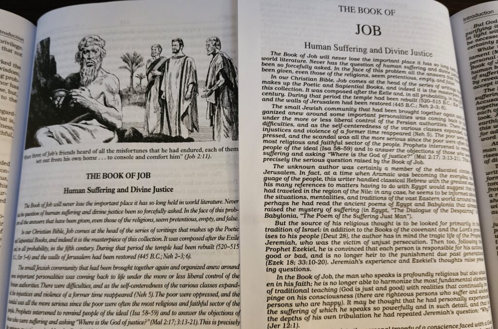 Both the St. Joseph Personal Size Edition and the Deluxe Gift Bible have book introductions printed in italics. On a first comparison, I thought the font was the same in the two editions, but the Deluxe Gift BIble’s introductions are printed in bold (and italics) with narrower line spacing. Based on a comment from Josh on the previous review post, I can see that the font is actually different. The shape of a lower-case “g” is different between the two fonts. Here is a comparison photo: