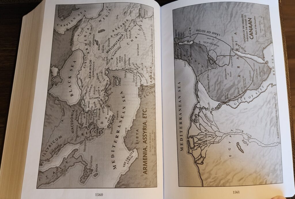 There are 8 pages of maps at the back of the Deluxe Gift Bible, printed in black-and-white on normal Bible paper. Here is a photo of two of the maps: