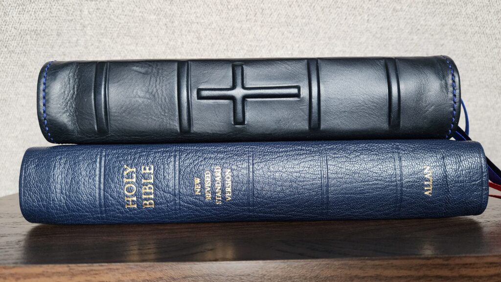 I’ve completed the “break-in” procedure detailed in Resurrection Rebinding’s video a few times. It has helped the Bible to open and lie flat more easily, but it hasn’t made any noticeable difference in allowing the spine to hinge open. I suspect this has something to do with the way the edge-lined leather cover is attached, compared to the old leatherette cover. If any readers understand the mechanics of this process, please enlighten me in the comments!