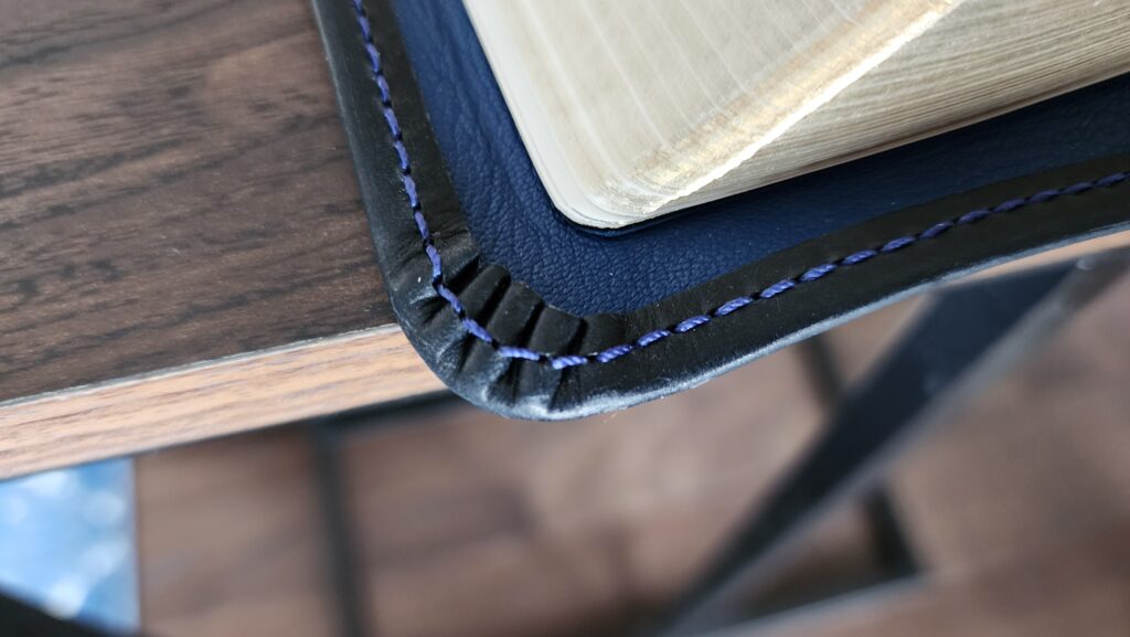 Overall, I’m quite happy with the quality of the leather and Melissa’s attention to detail on the corners and perimeter stitching. I especially like the understated pop of color from the blue thread which she used for the perimeter stitching as it contrasts with the navy cover. If I look closely and compare this Bible to the RL Allan NRSV, it is obvious that the rebind is not as perfect as the Allan. I can see very slight imperfections (for example, the cut edge of the cowhide cover along the interior perimeter is not precisely, perfectly straight). But in my mind, that is entirely expected for a handmade rebind. Overall, the quality of Melissa’s detail work appears very good.