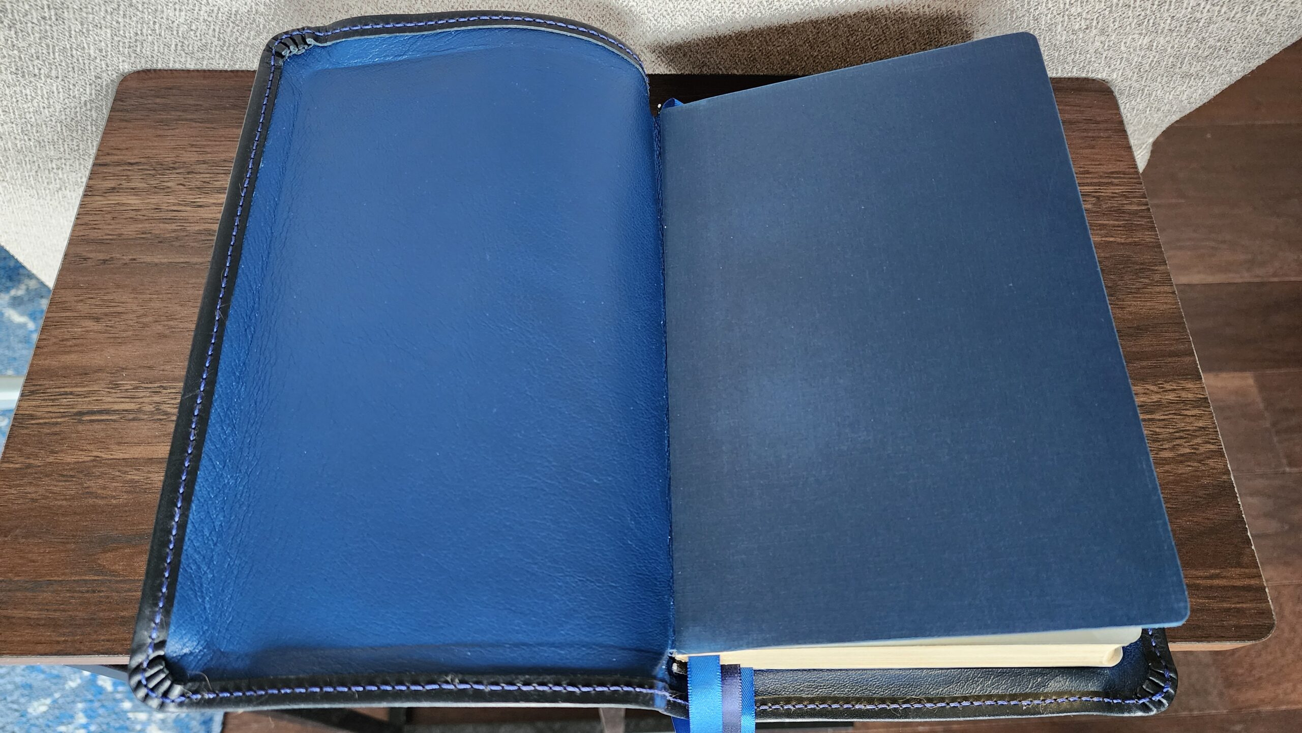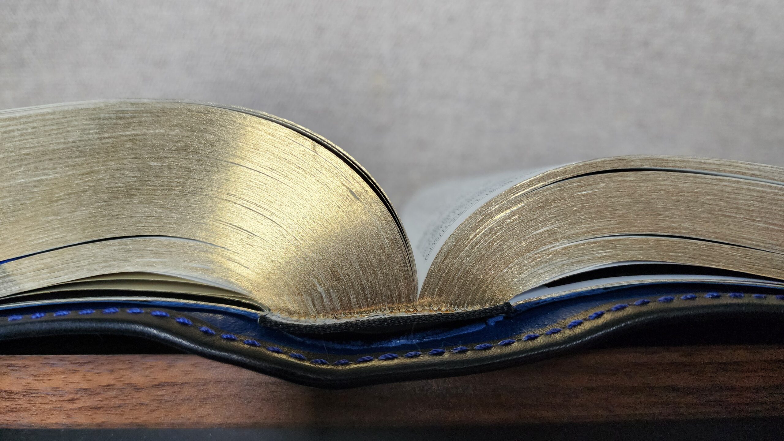 Overall, I’m quite happy with the quality of the leather and Melissa’s attention to detail on the corners and perimeter stitching. I especially like the understated pop of color from the blue thread which she used for the perimeter stitching as it contrasts with the navy cover. If I look closely and compare this Bible to the RL Allan NRSV, it is obvious that the rebind is not as perfect as the Allan. I can see very slight imperfections (for example, the cut edge of the cowhide cover along the interior perimeter is not precisely, perfectly straight). But in my mind, that is entirely expected for a handmade rebind. Overall, the quality of Melissa’s detail work appears very good.